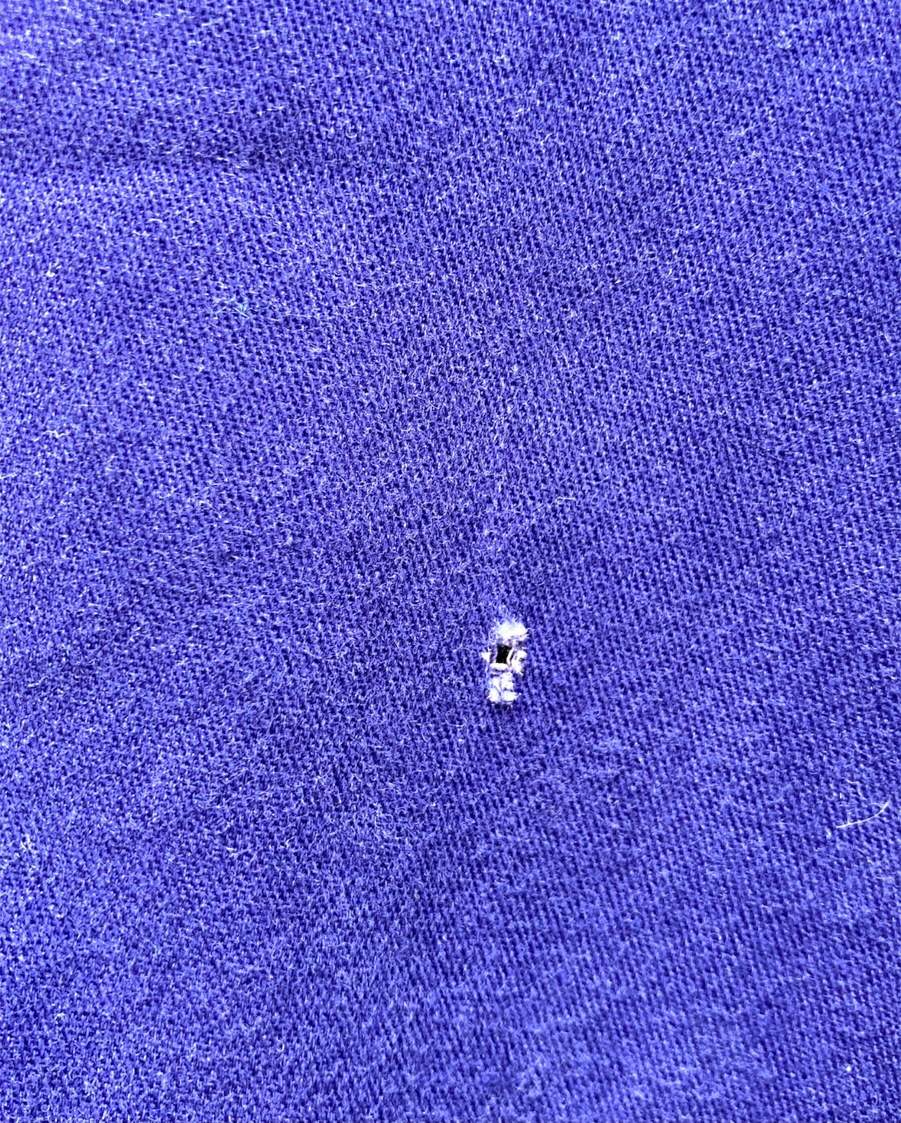 右胸ポケット、フロントボタンホール、企業刺繍にほつれあり。